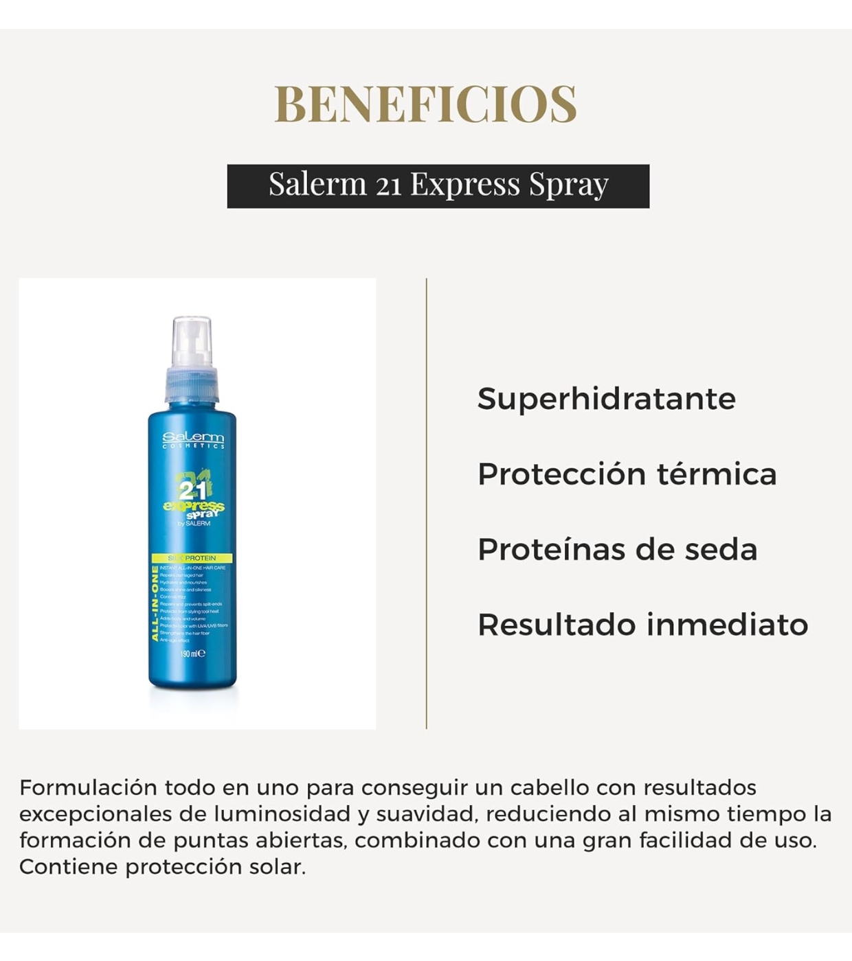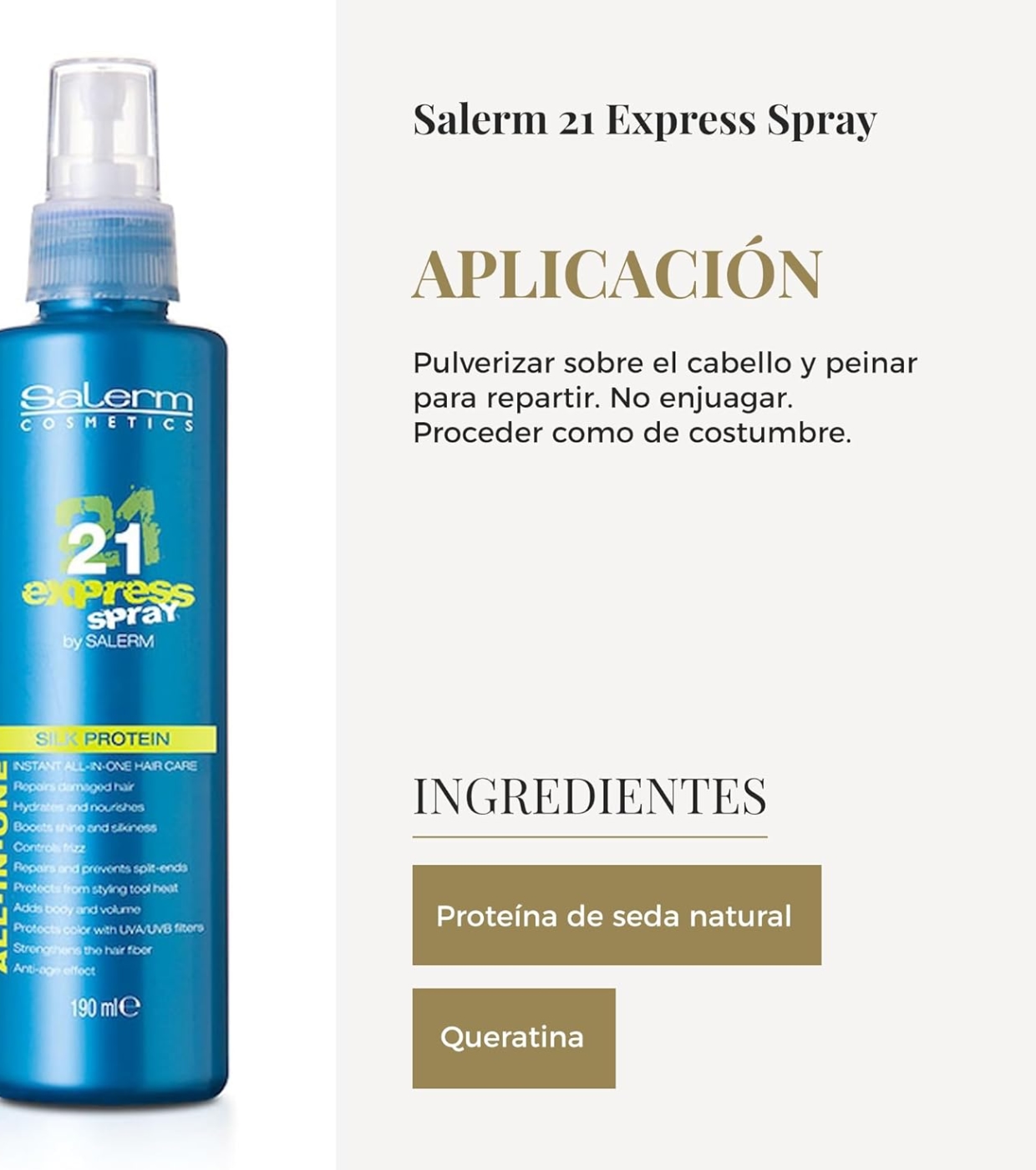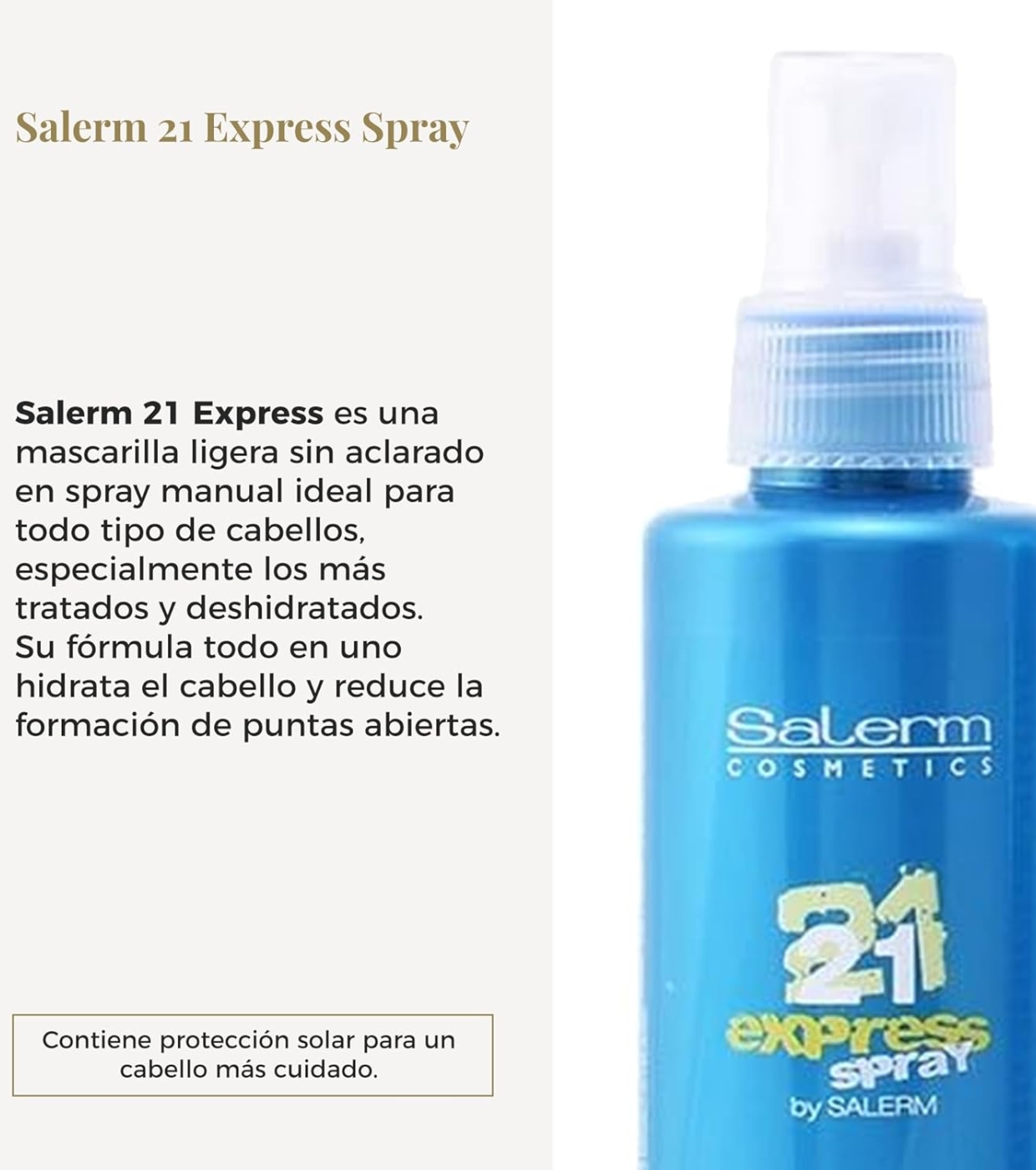Enjoy soft, shiny and protected hair in seconds with Salerm 21 Express by Salerm , the leave-in mask in spray format that provides intense hydration and immediate results.