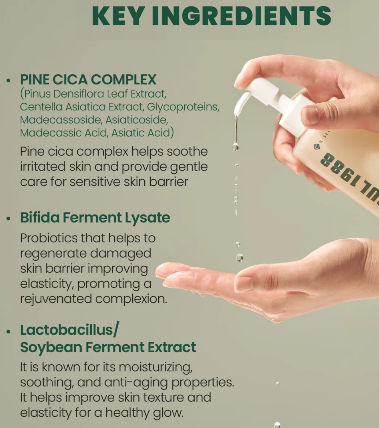Ethylhexyl Palmitate, Sorbeth-30 Tetraoleate, Pinus Densiflora Leaf Extract, Centella Asiatica Extract, Butylene Glycol, Bifida Ferment Filtrate, Helianthus Annuus Seed Oil, Macadamia Integrifolia Seed Oil, Olea Europaea Fruit Oil, Simmondsia Chinensis Seed Oil, Vitis Vinifera Seed Oil, Vegetable Oil, 1,2-Hexanediol, Pentylene Glycol, Asiatic Acid, Asiaticoside, Glycoproteins, Madecassic Acid, Madecassoside, Aqua/Water, Glycerin, Lactobacillus/Soybean Ferment Extract