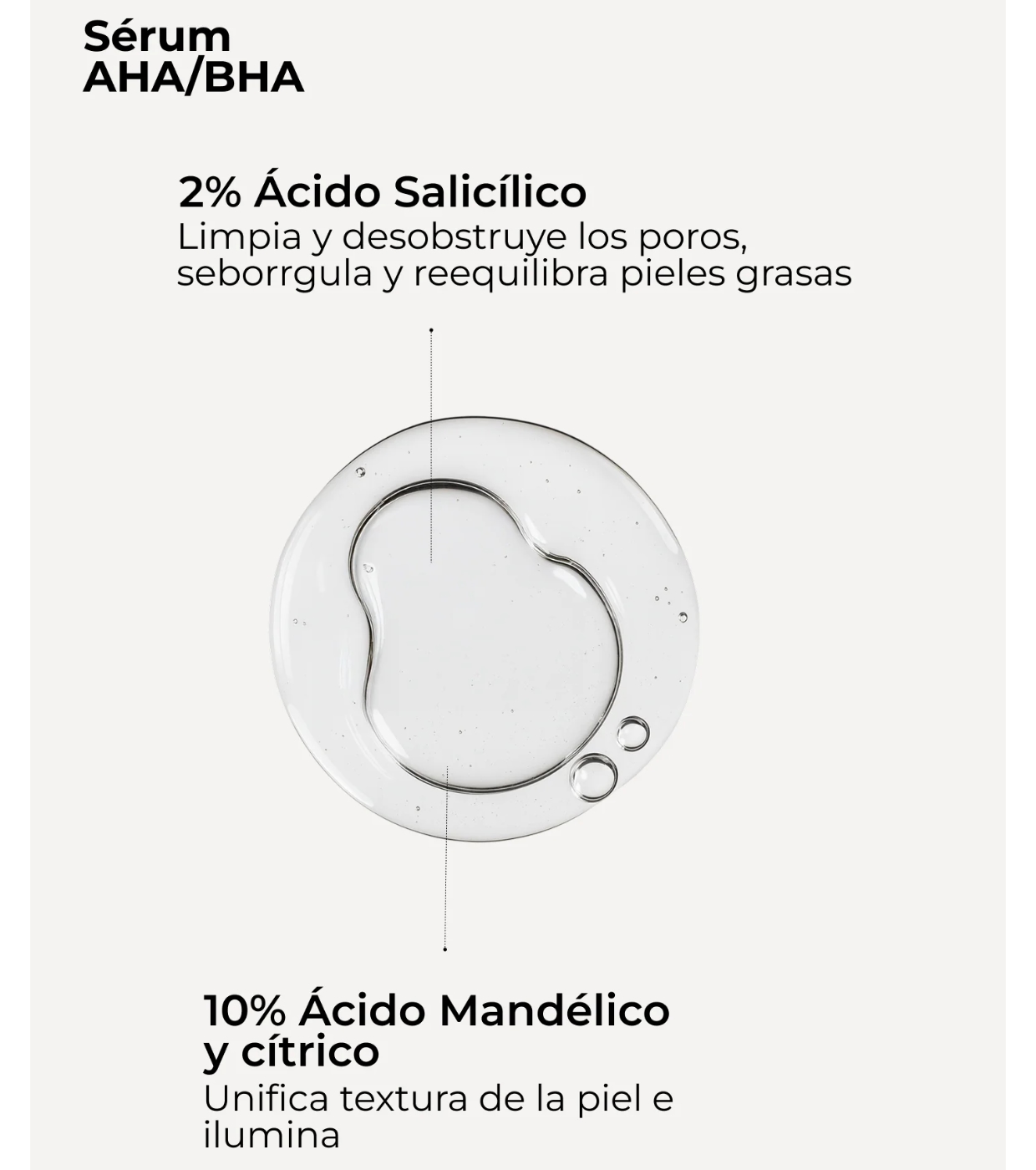 AHA/BHA: AQUA, ALCOHOL DENAT, PROPYLENE GLYCOL, MANDELIC ACID, GLYCERIN, SALICYLIC ACID, AVENA SATIVA KERNEL EXTRACT, CHAMOMILLA RECUTITA FLOWER EXTRACT, MALVA SYLVESTRIS FLOWER EXTRACT, CITRIC ACID, PHYTIC ACID, TOCOPHEROL, POLYSORBATE 20, PROPANEDIOL, PHENYLPROPANOL, CAPRYLYL GLYCOL, POTASSIUM SORBATE, HYDROXYETHYLCELLULOSE, SODIUM BENZOATE, SODIUM HYDROXIDE, PARFUM.