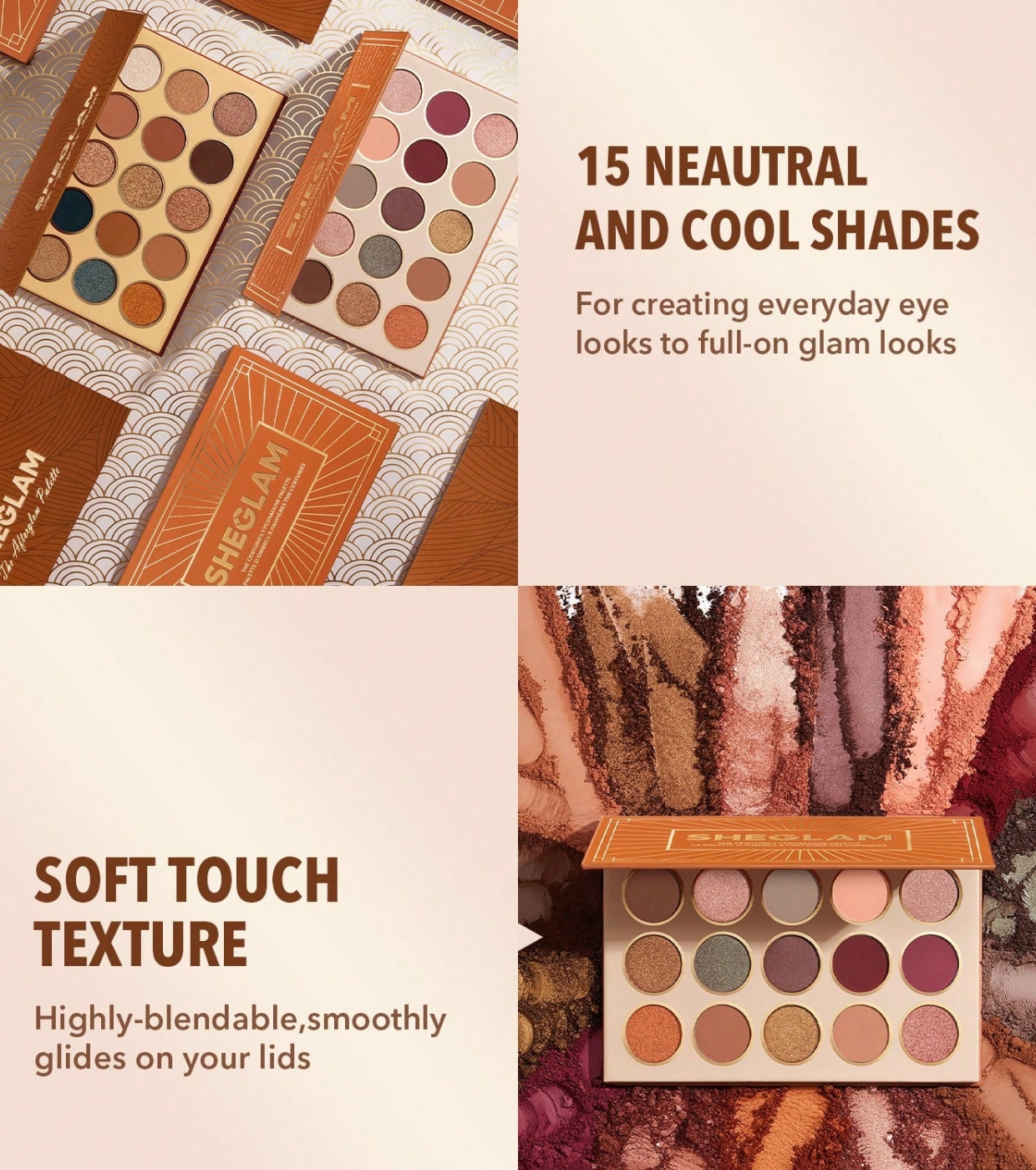 Discover your new Afterglow eyeshadow palette from SHEGLAM with 15 neutral and cool shades designed to create everything from elegant everyday looks to glamorous and sophisticated makeup.
