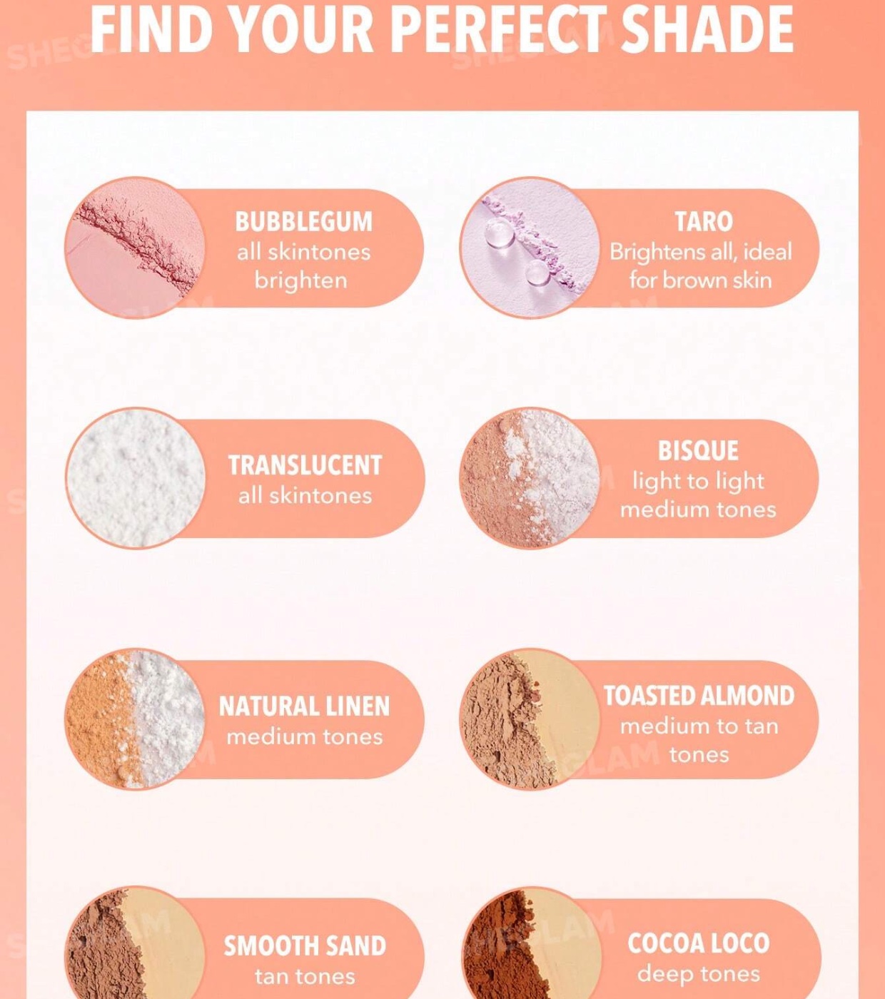 You and your makeup make a great team… don't let it fade. Incorporate SHEGLAM 's Insta-Ready face and contour setting powder into your routine, designed to seal, smooth, and keep your look perfect for hours.