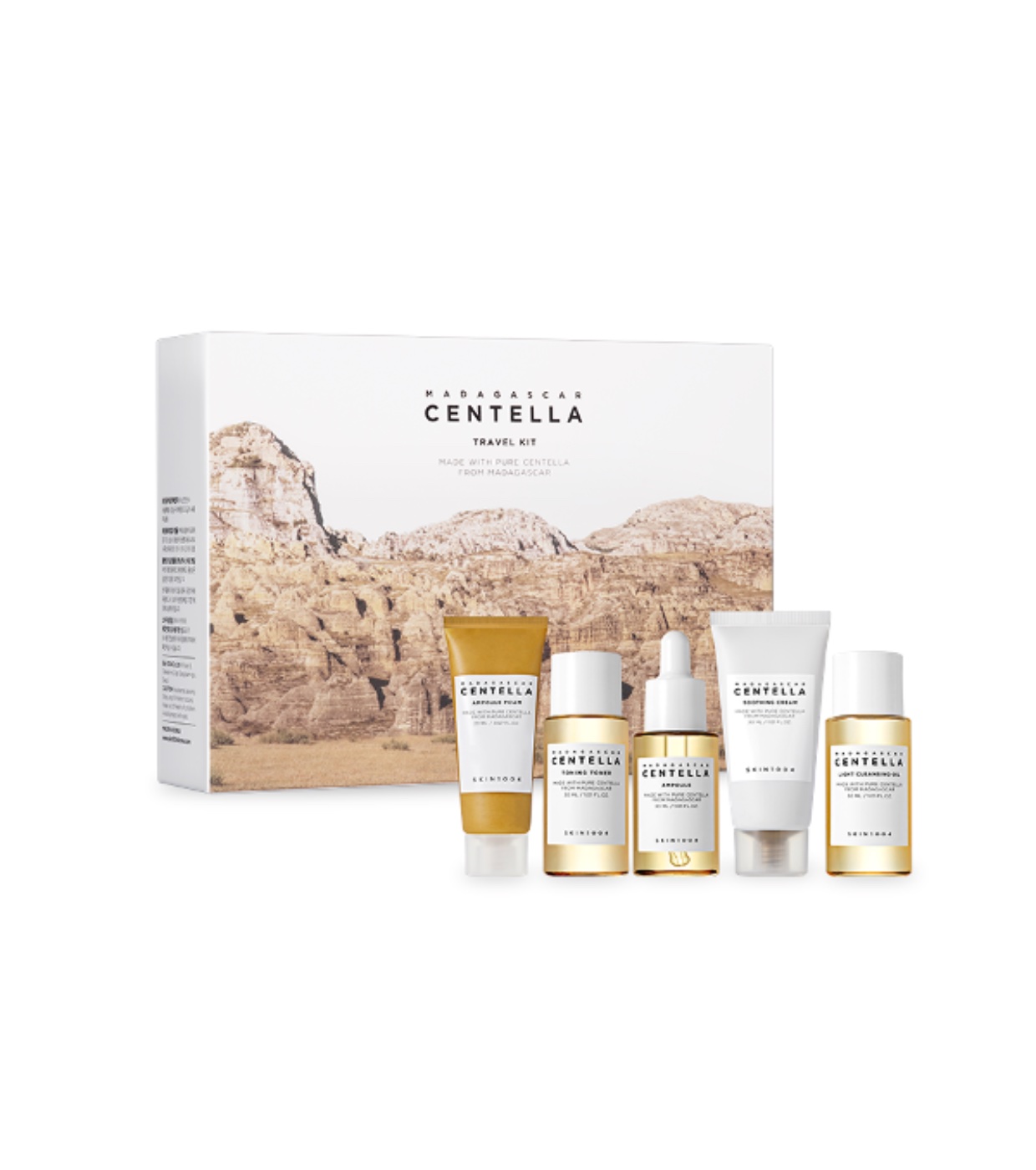 The SKIN1004 Madagascar Centella Ampoule, Toner, Cream, Cleansing Oil Travel Kit is the perfect set to keep your skin calm, nourished and hydrated during long trips or getaways. Featuring five travel-sized products, this portable kit is infused with Centella Asiatica extract, a natural ingredient renowned for its soothing and regenerating properties, ideal for all skin types, including sensitive skin.