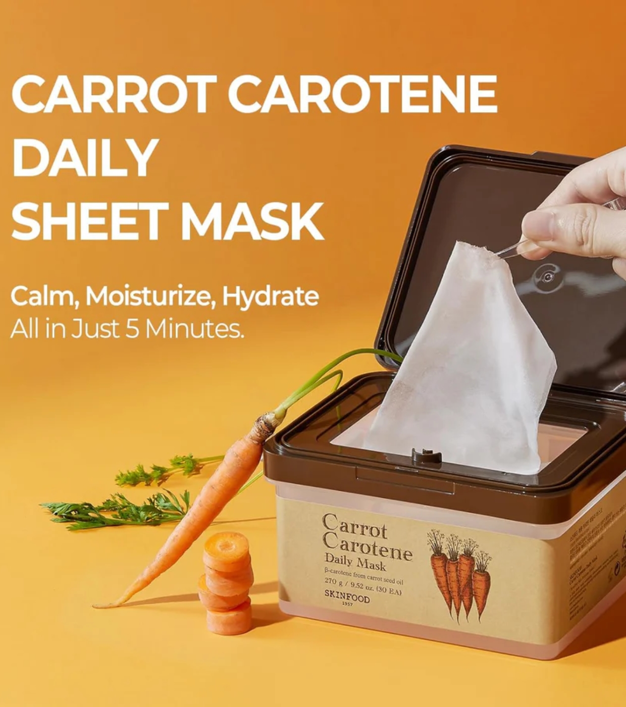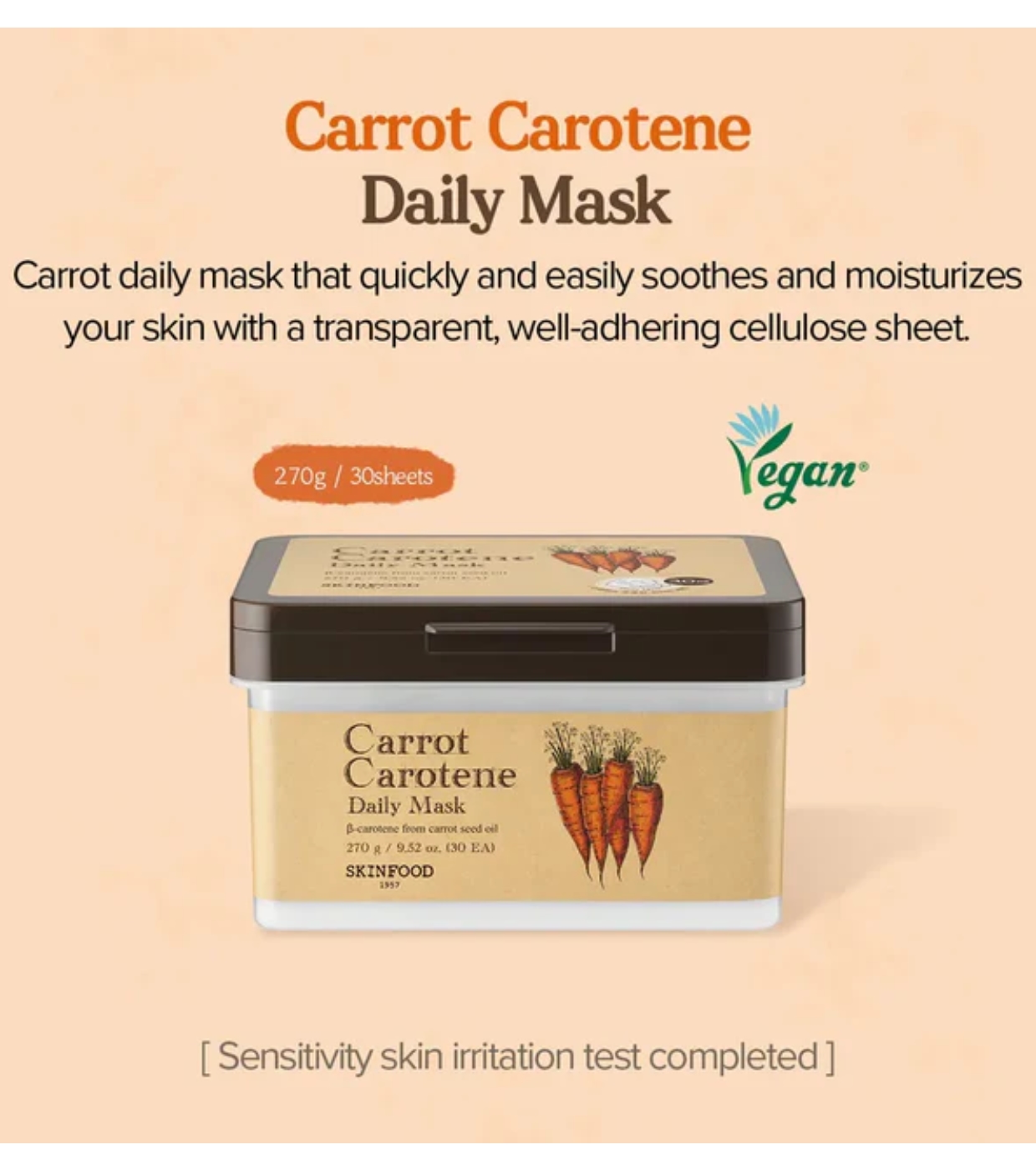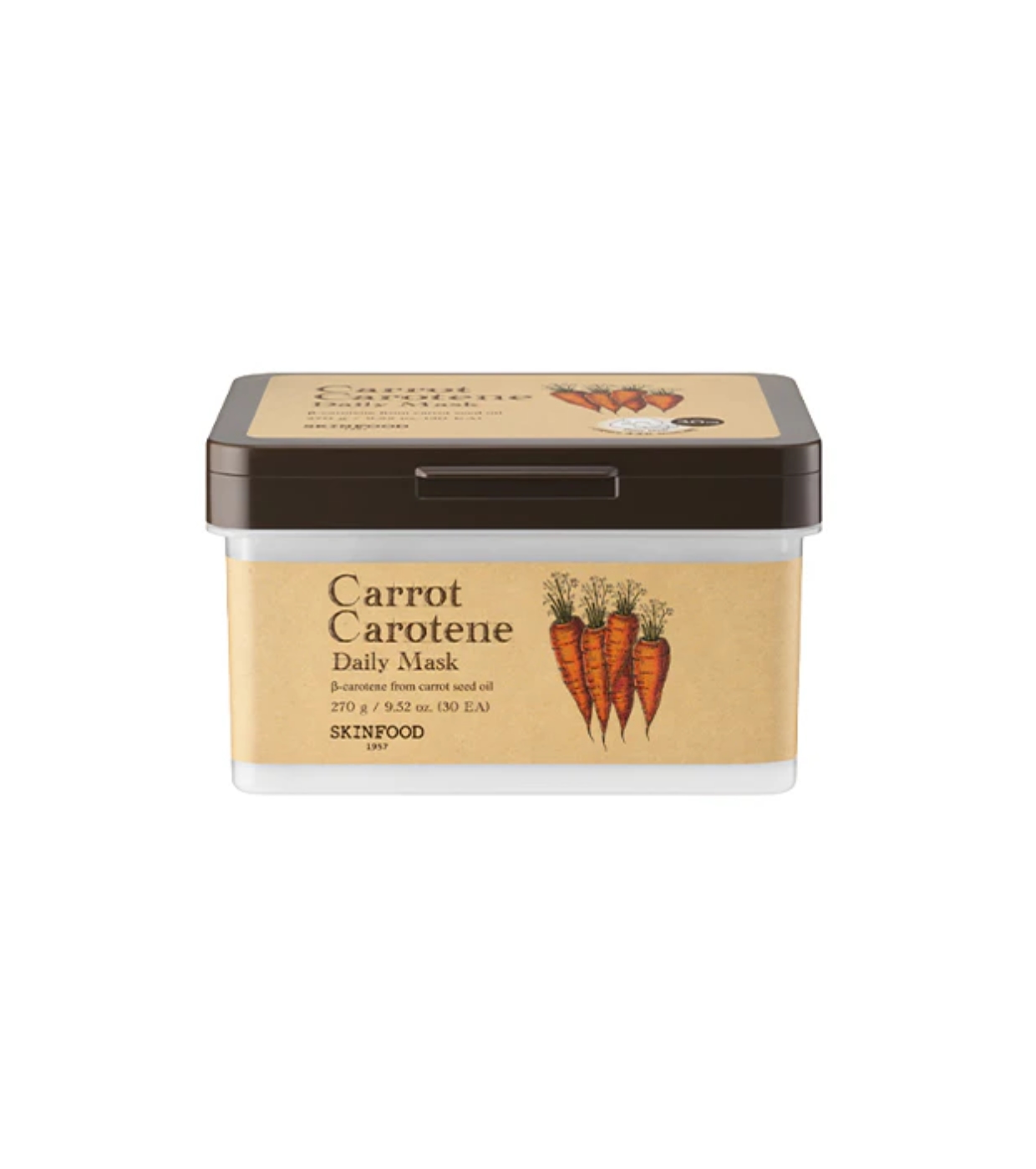 Skinfood Skinfood Daily Mask is formulated with organic carrot extract rich in beta-carotene (carotene) and natural antioxidants that help soothe, hydrate, and revitalize stressed and dull skin.