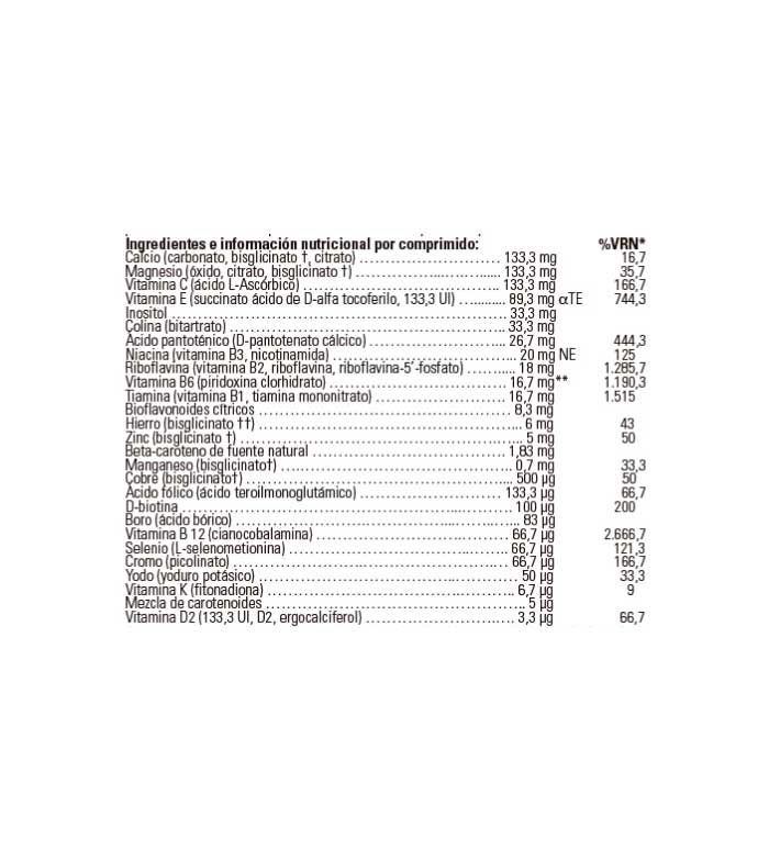Calcio (carbonato, bisglicinato, citrato), Magnesio (óxido, citrato, bisglicinato), Vitamina C (ácido L-Ascórbico), Vitamina E (succinato ácido de D-alfa tocoferilo, 133,3 UI), Inositol, Colina (bitartrato), Ácido pantoténico (D-pantotenato cálcico), Niacina (vitamina B3, nicotinamida), Riboflavina (vitamina B2, riboflavina, riboflavina-5’-fosfato), Vitamina B6 (piridoxina clorhidrato), Tiamina (vitamina B1, tiamina mononitrato), Bioflavonoides cítricos, Hierro (bisglicinato), Zinc (bisglicinato), Beta-caroteno de fuente natural, Manganeso (bisglicinato), Cobre (bisglicinato), Ácido fólico (ácido teroilmonoglutámico), D-biotina, Boro (ácido bórico), Vitamina B 12 (cianocobalamina), Selenio (L-selenometionina), Cromo (picolinato), Yodo (yoduro potásico), Vitamina K (fitonadiona), Mezcla de carotenoides, Vitamina D2 (133,3 UI, D2, ergocalciferol). Agentes de carga: maltodextrina, celulosa microcristalina, hidroxipropilcelulosa, fosfato dicálcico, alginato, almidón de guisante, manitol, hidroxipropilmetilcelulosa, ácido cítrico; Goma de celulosa; Antiaglomerantes: estearato magnésico vegetal, dióxido de silicio, ácido esteárico vegetal; Colorantes: dióxido de titanio, zanahoria púrpura en polvo; Agentes de recubrimiento: hidroxipropilmetilcelulosa, glicerina vegetal (de aceite de semilla de palma y aceite de coco).