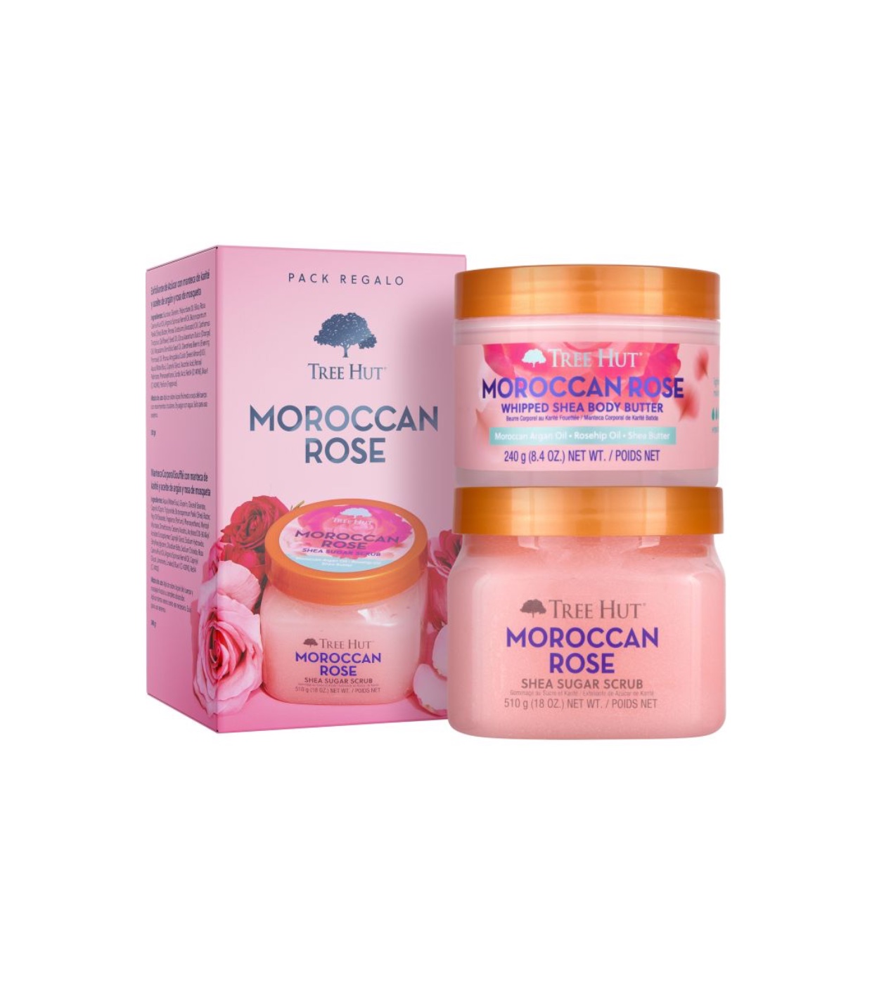 This exclusive set includes two body care essentials: Shea Body Butter and Shea Body Scrub, both infused with the intoxicating scent of Moroccan rose.