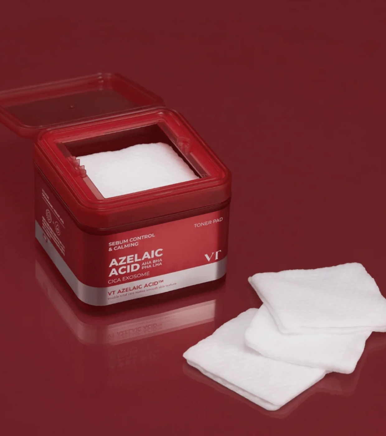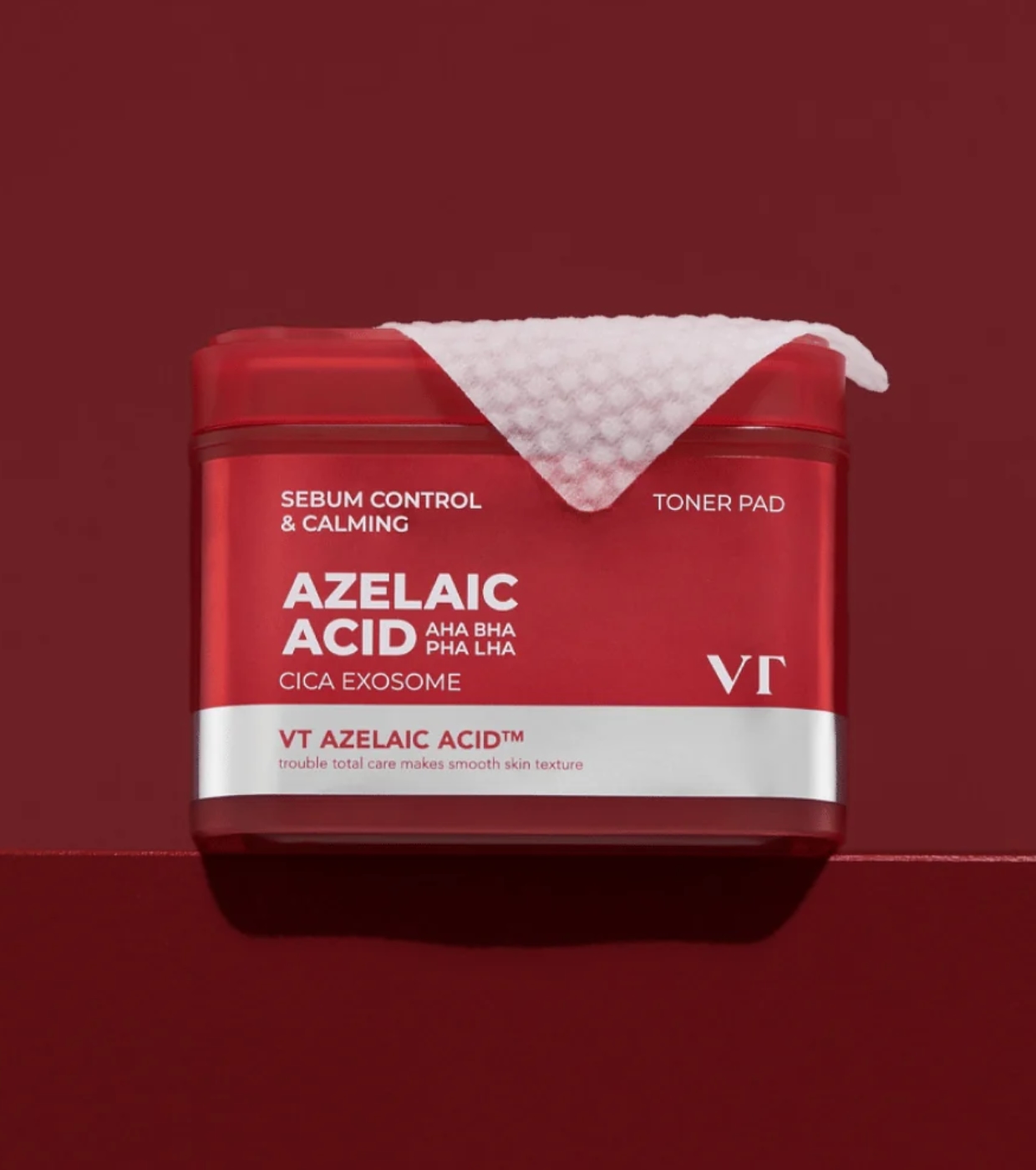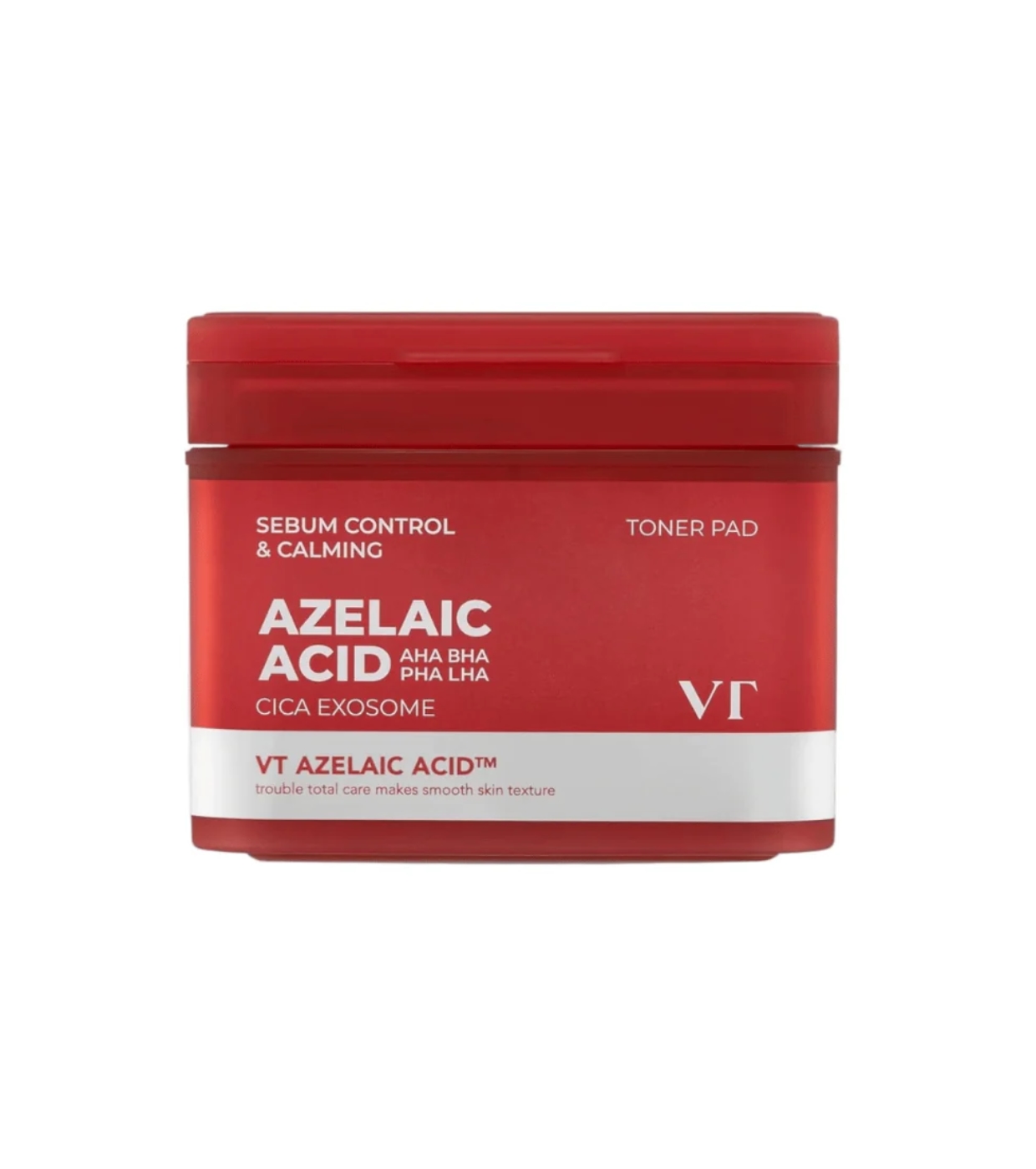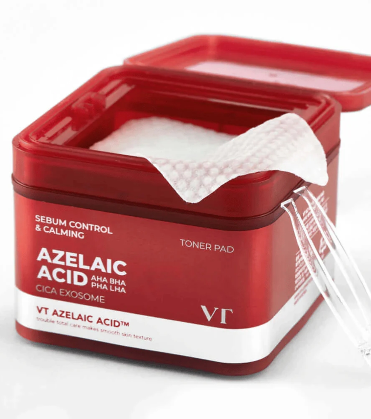 Part of the AZ Care line, this facial toner pad Azelaic Acid CICA Exosome from VT Cosmertics with azelaic acid is designed to treat acne-prone skin, helping to balance, purify and improve texture from the first use.