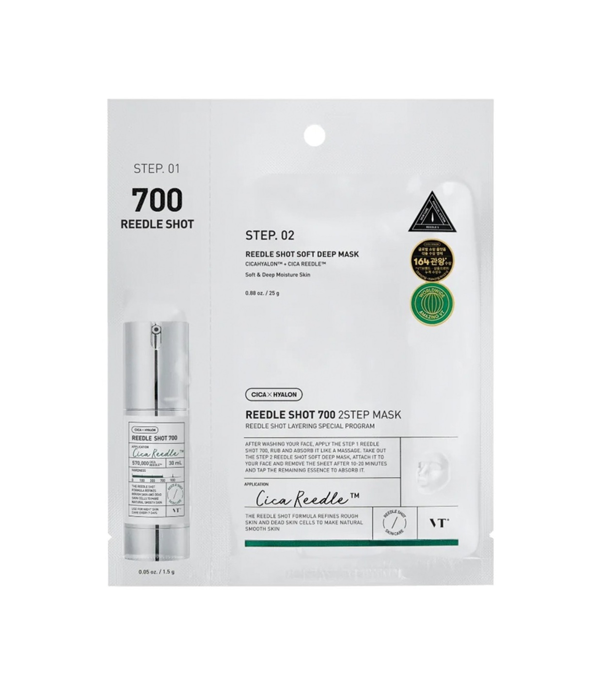 Dull, lackluster, or uneven skin texture? The VT Reedle Shot 700 2-Step Mask 2-Step Mask is the perfect solution to restore vitality and freshness to your face.