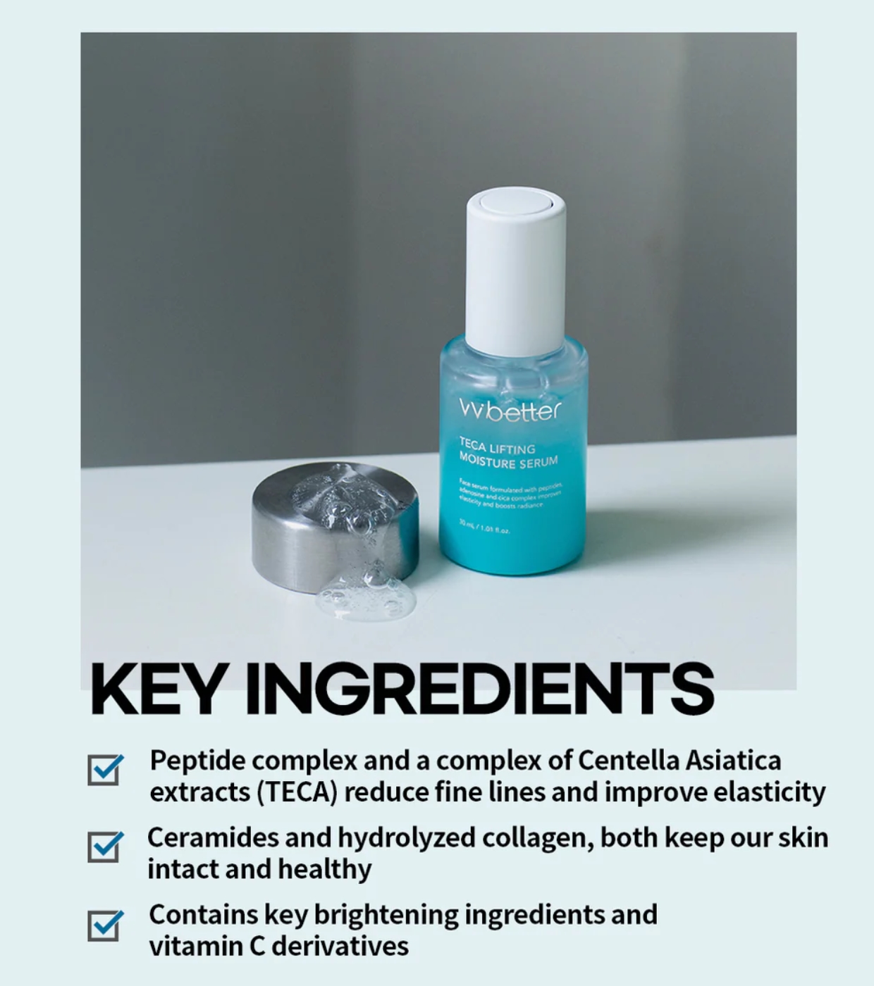 A concentrated treatment that transforms your skin from the first application. This Teca Lifting Moisture firming serum from vvbetter combines powerful hydrating, brightening, and firming active ingredients to improve your skin's texture, tone, and elasticity.