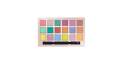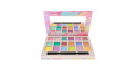 Contains 18 eyeshadows in shades ranging from pinks to blues, greens, and purples in matte, satin, and shimmer finishes.