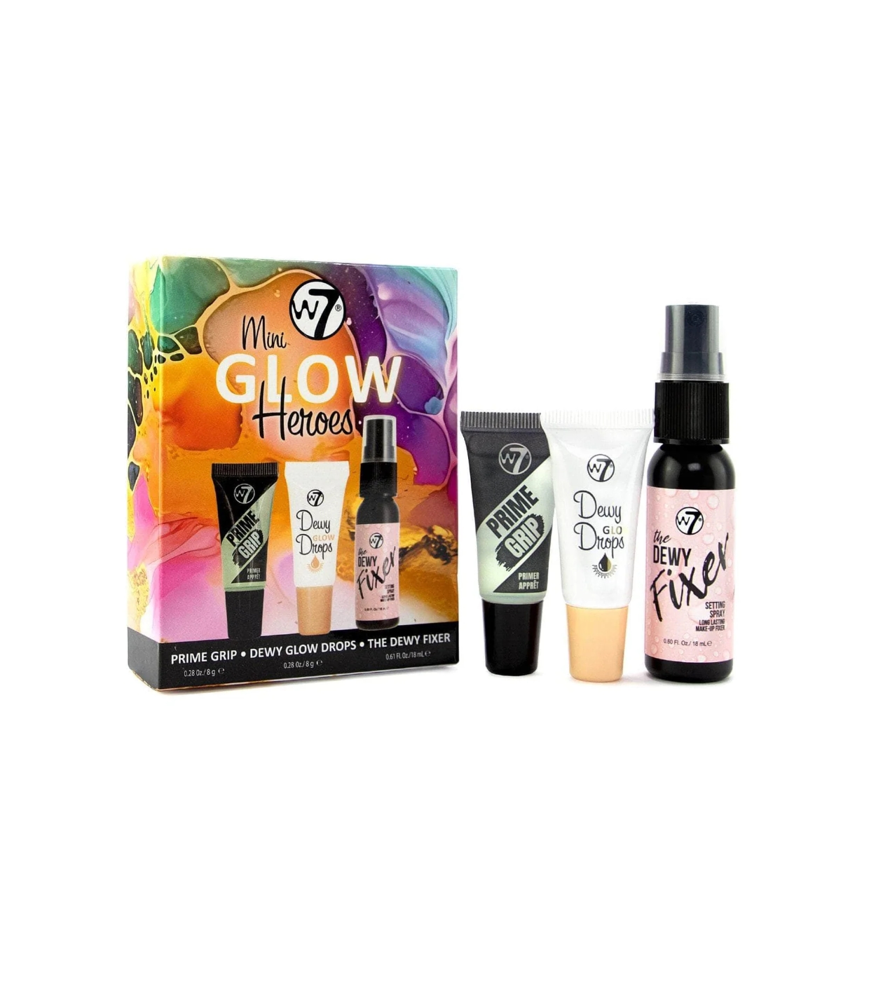 Show off radiant skin with the W7 Mini Glow Heroes Set , an essential kit that brings together three mini products to prepare, illuminate and set your makeup.