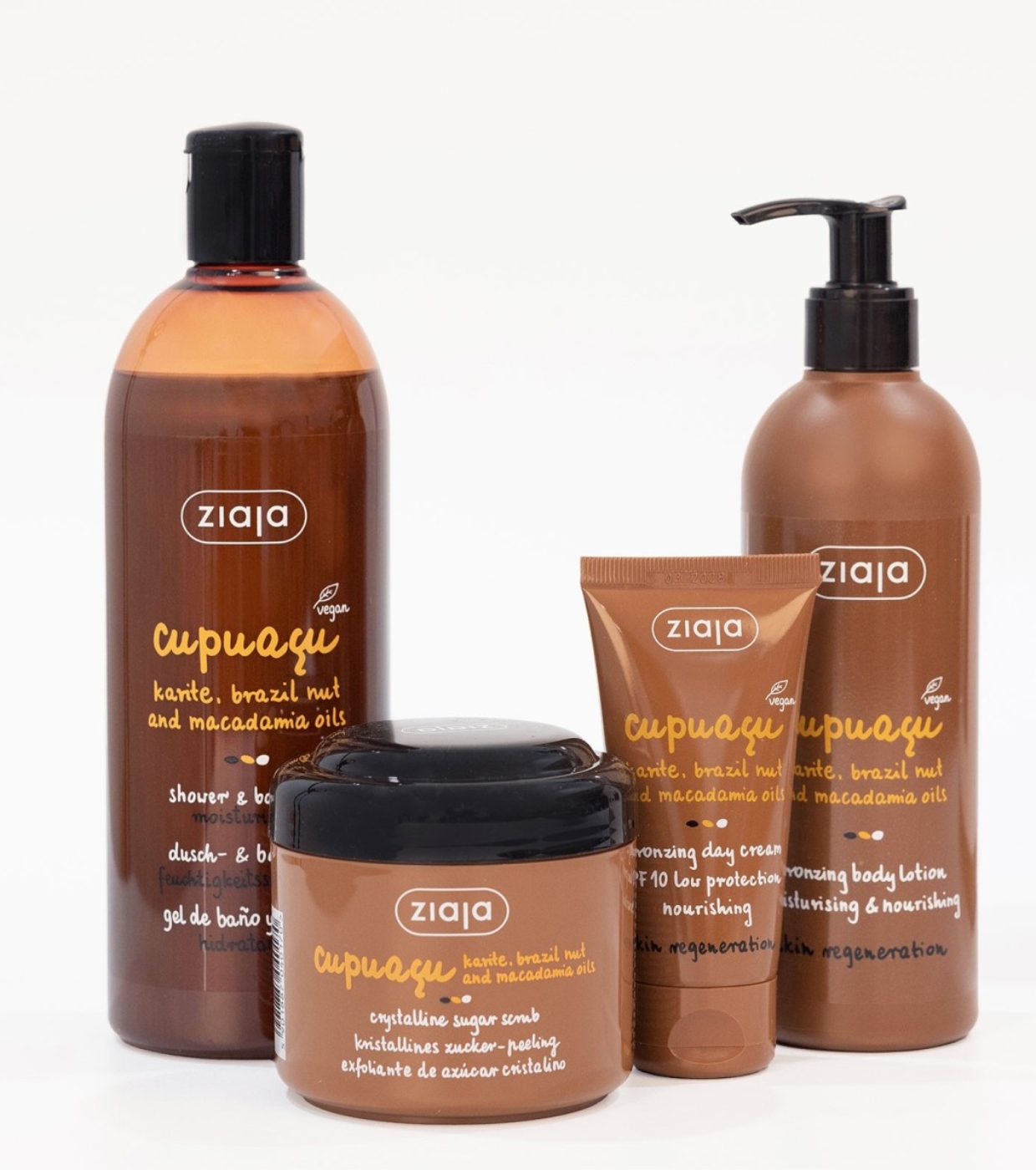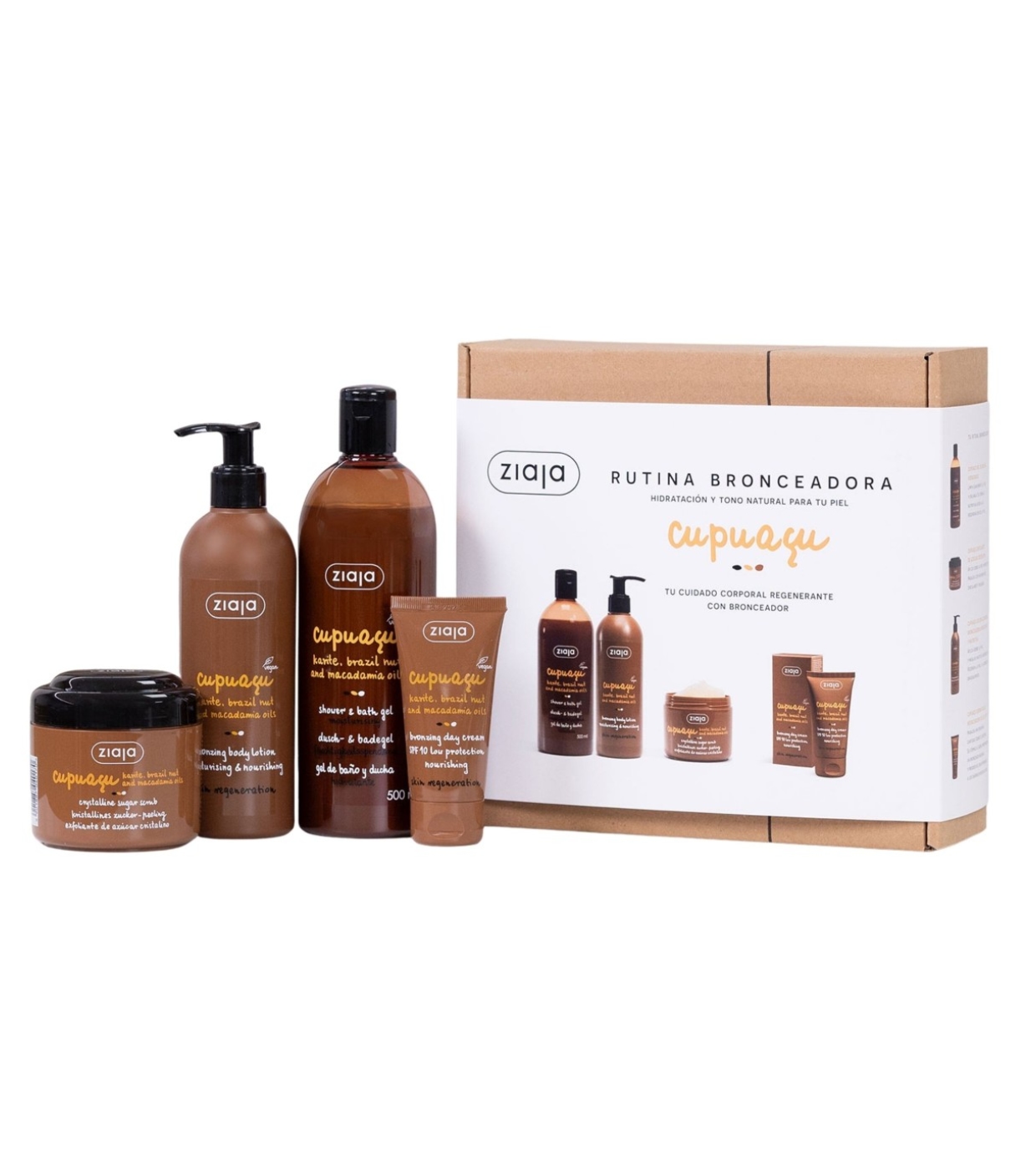 The Cupuaçu Tanning Routine Set from Ziaja brings together four essential body care products that hydrate, regenerate and improve skin texture while providing a natural and even tan on the face and body.